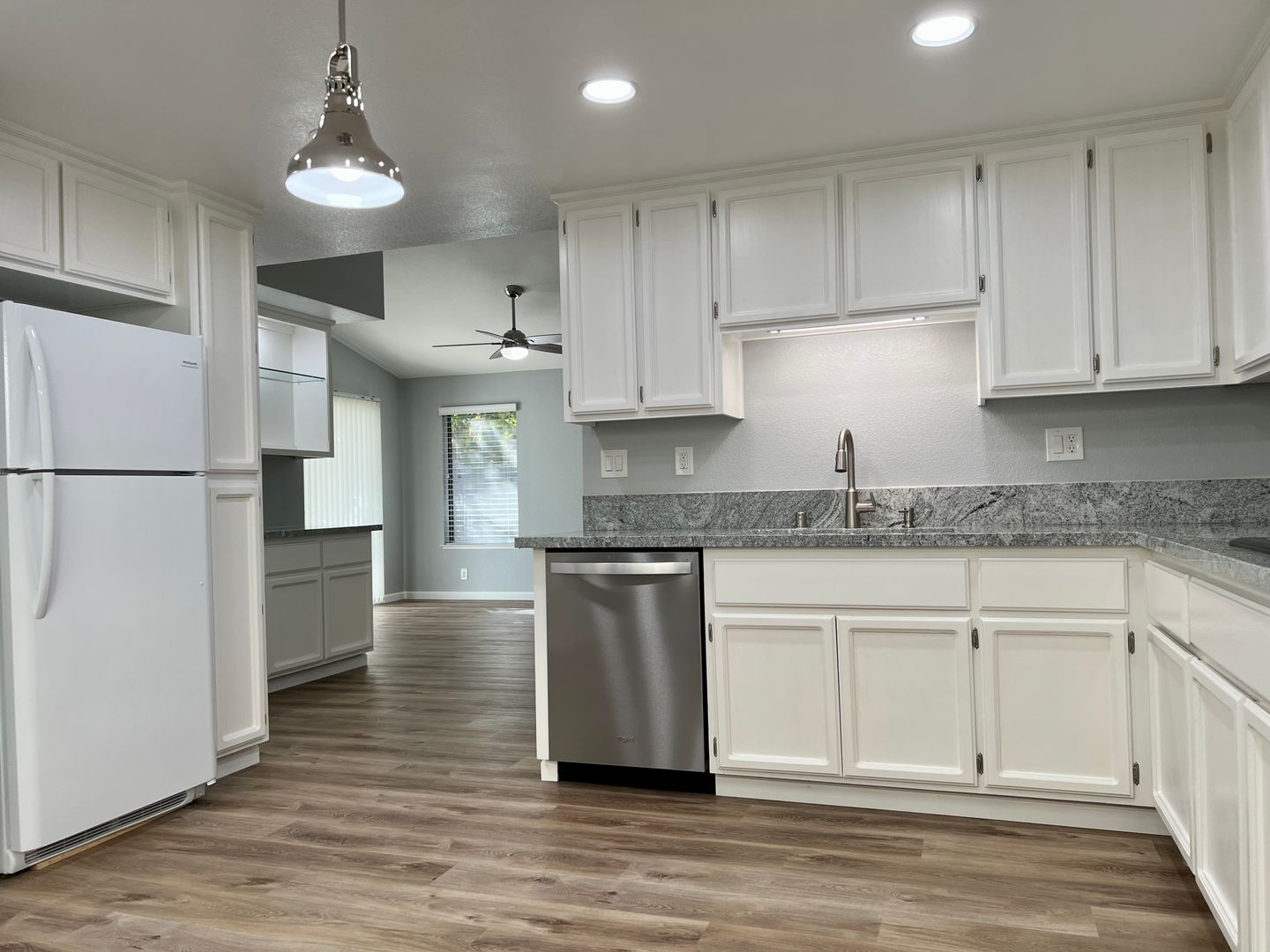 This is a very clean, recently renovated home situated on a tree lined corner lot within the gated community of Hampton Village in Roseville. This newly upgraded home has a spacious entry with clear sight lines to the open, vaulted living room with a formal dining room and bright, white kitchen beyond. There are two secondary bedrooms off of the separate left side hallway and the primary suite to the right boasts a very tastefully remodeled bath with custom tile and double vanity. Walking through the home, you will find a separate dining area with built in, lighted shelving and a bright, inviting kitchen to the left. The fully equipped laundry room leads out to the two-car garage with plenty of shelving and overhead storage for all of your off-season items.